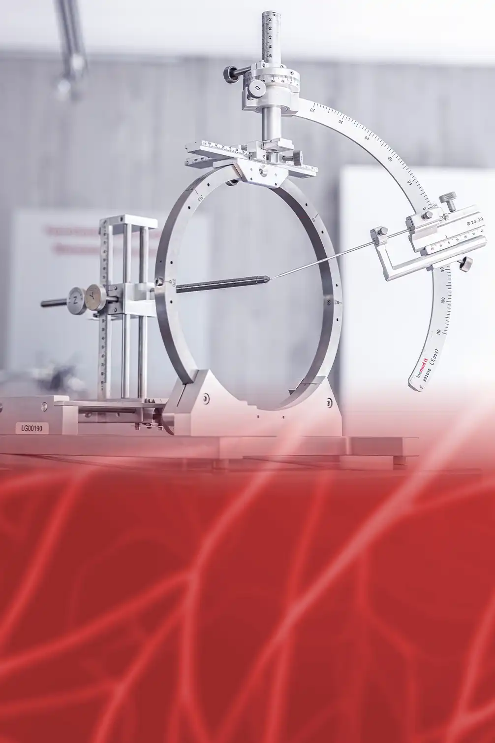Art.-Nr.: 803000Positionierungshilfe für inomed StereotaxiesystemeZum schnellen und zuverlässigen Ausrichten des Titanrings am Patientenkopf durch eine einzelne Person. Eine Ausrichtung in jede Orientierung wird ermöglicht.